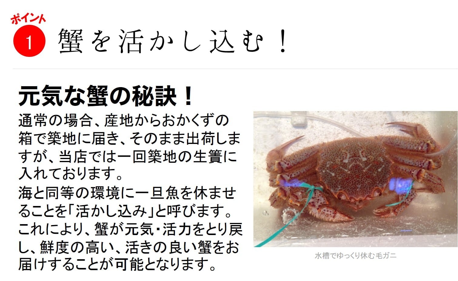 1.「活かし込む」ことで元気で鮮度の高いカニを!