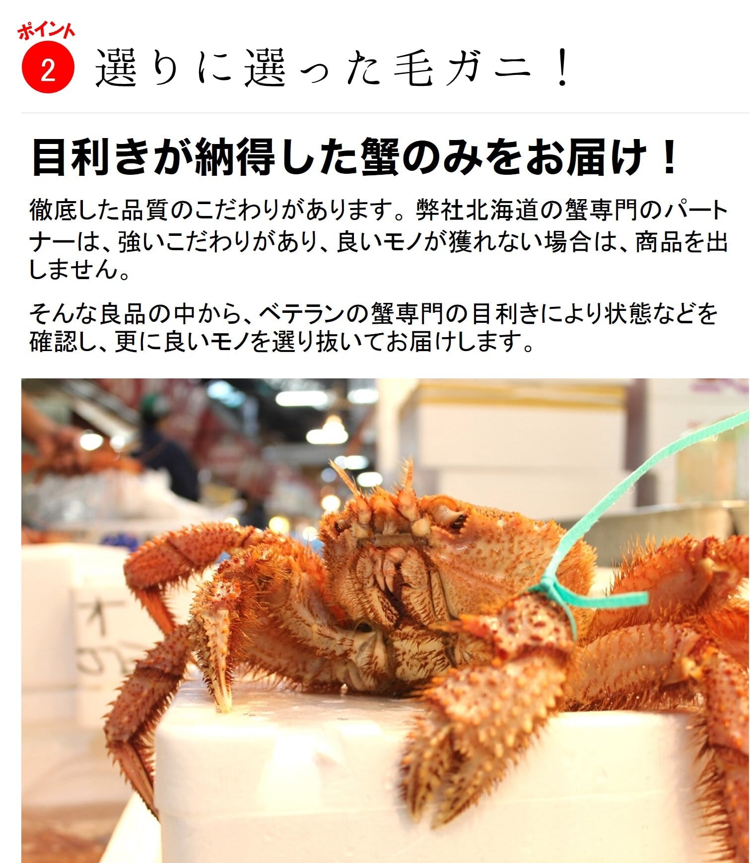 弊社北海道の蟹専門家のパートナーは、良いモノが獲れない場合は商品を出しません。更に弊社目利きにより選りすぐって良いモノのみお届けします。