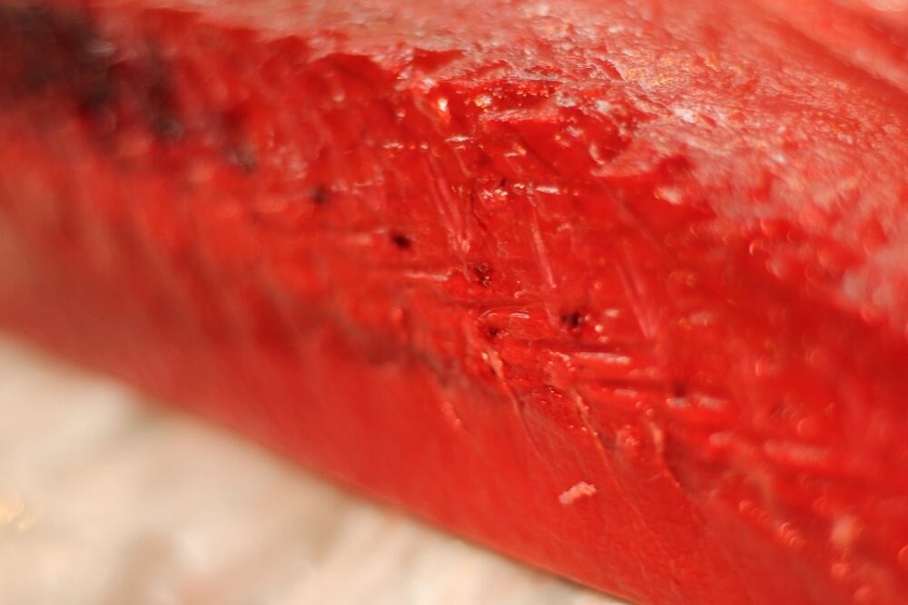 カツオは非常に色変わりの早い魚であります。お届けしたタイミングで、写真のような色合いで無い可能性が高いです。その場合は、外側を削いで頂ければ、キレイな赤身が出てきますので、そのようにしてお召し上がりになって頂ければと思います。