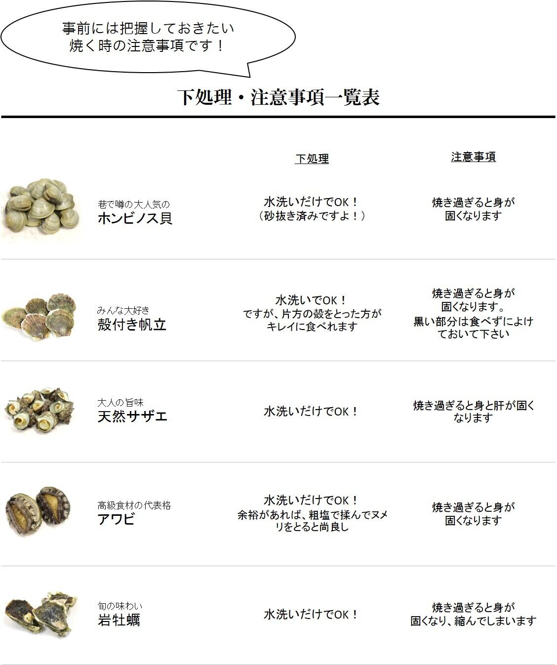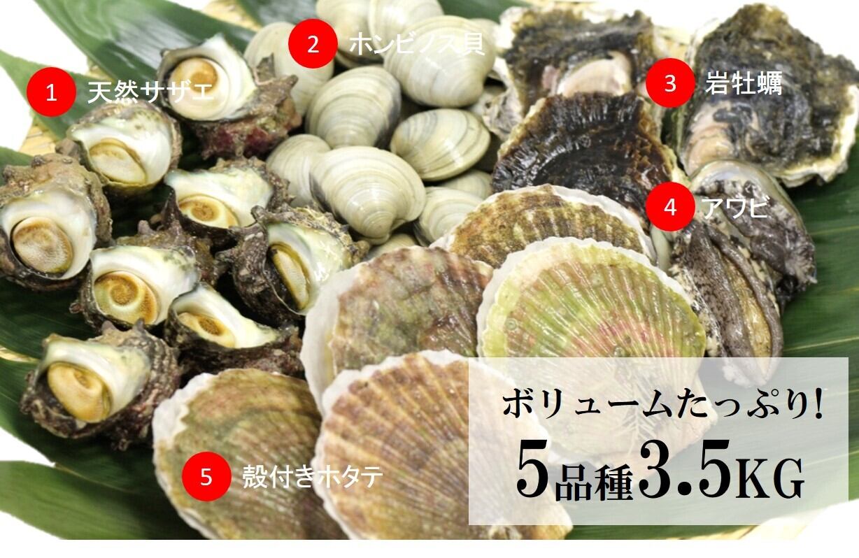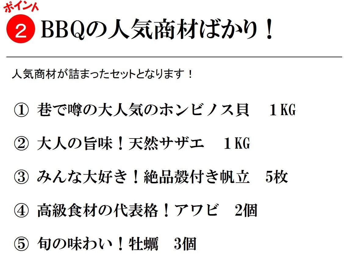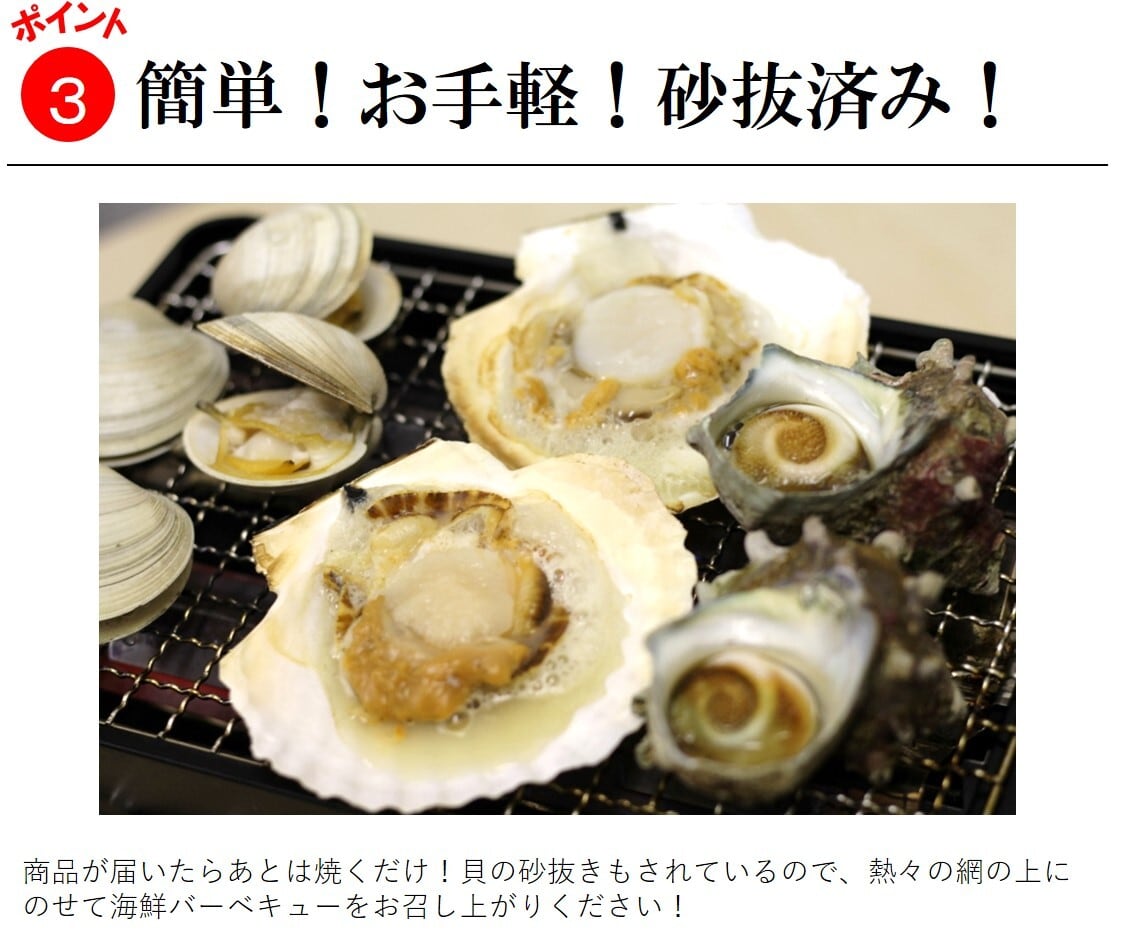 ・内容量:ホンビノス1kg(千葉産 他)サザエ1kg(長崎産 他)ホタテ5枚(宮城産 他)岩カキ3枚(長崎産 他)アワビ2枚(韓国産 他)