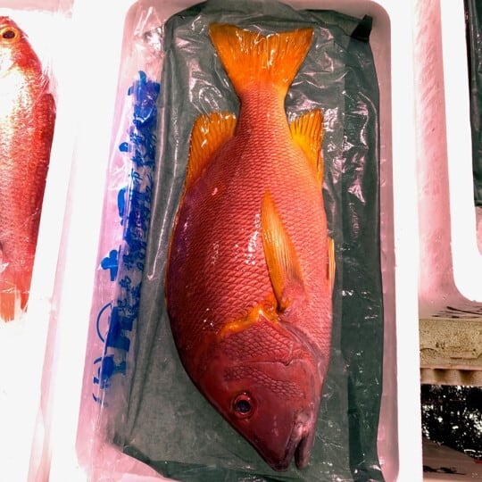 幻の超高級魚と言われて白星フエダイ。南方の魚はカラフルで脂がのっていない魚も多い中、こちらのフエダイは脂のノリが抜群。非常に甘みのある白身魚で大変美味。豊かな味わいで、食通の間で高く評価されています。
